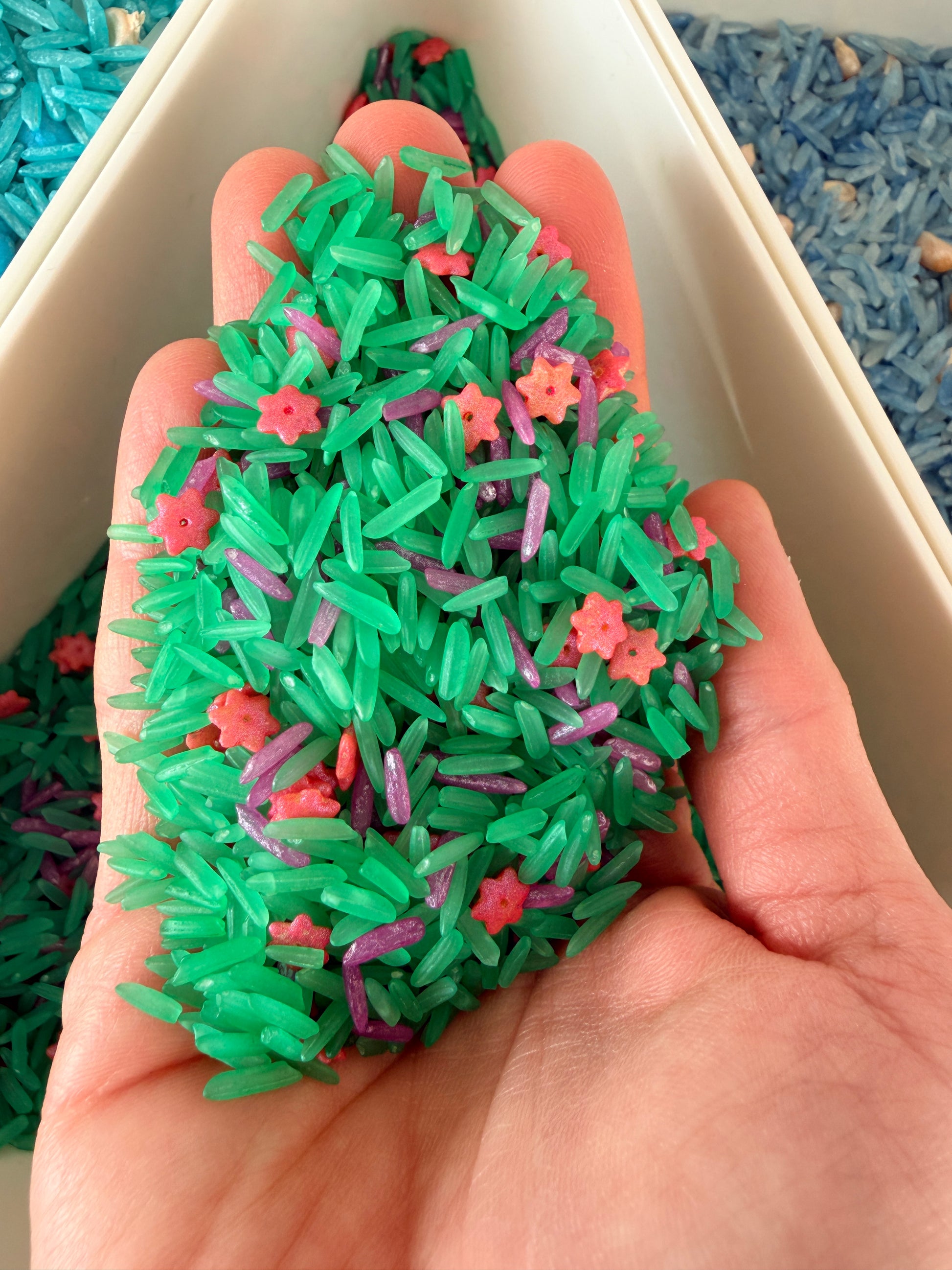 Achtung - Spiel- & Lernmaterial für Kinder Unsere Produkte dienen dem sensorischen Spiel und sind keine Lebensmittel. - Nur unter ständiger Aufsicht eines Erwachsenen verwenden. - Nicht für Kinder unter 3 Jahren geeignet (Verschluckungsgefahr) - Einzelteile oder Füllmaterial nicht in den Mund, die Nase oder die Augen stecken. - Kontakt mit Wasser vermeiden, inbesondere bei Füllmaterialien, da sich Farben lösen können. - Nach dem Spielen trocken und sauber lagern.